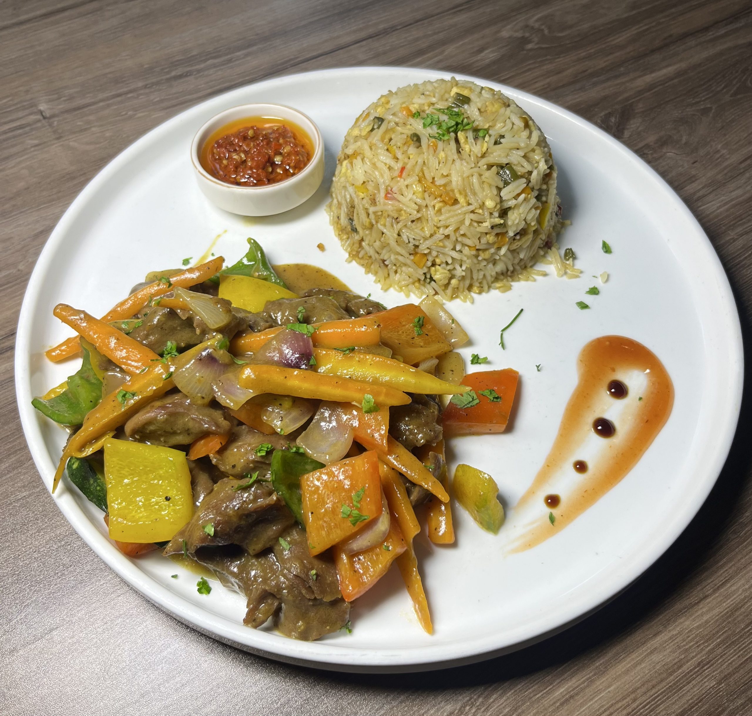 Tender Chunk of Slow-Cooked Imported Beef Fillet Simmered in Rich Flavoured Gravy, Enhanced with Vegetables, Served on a Sizzling Hot Plate