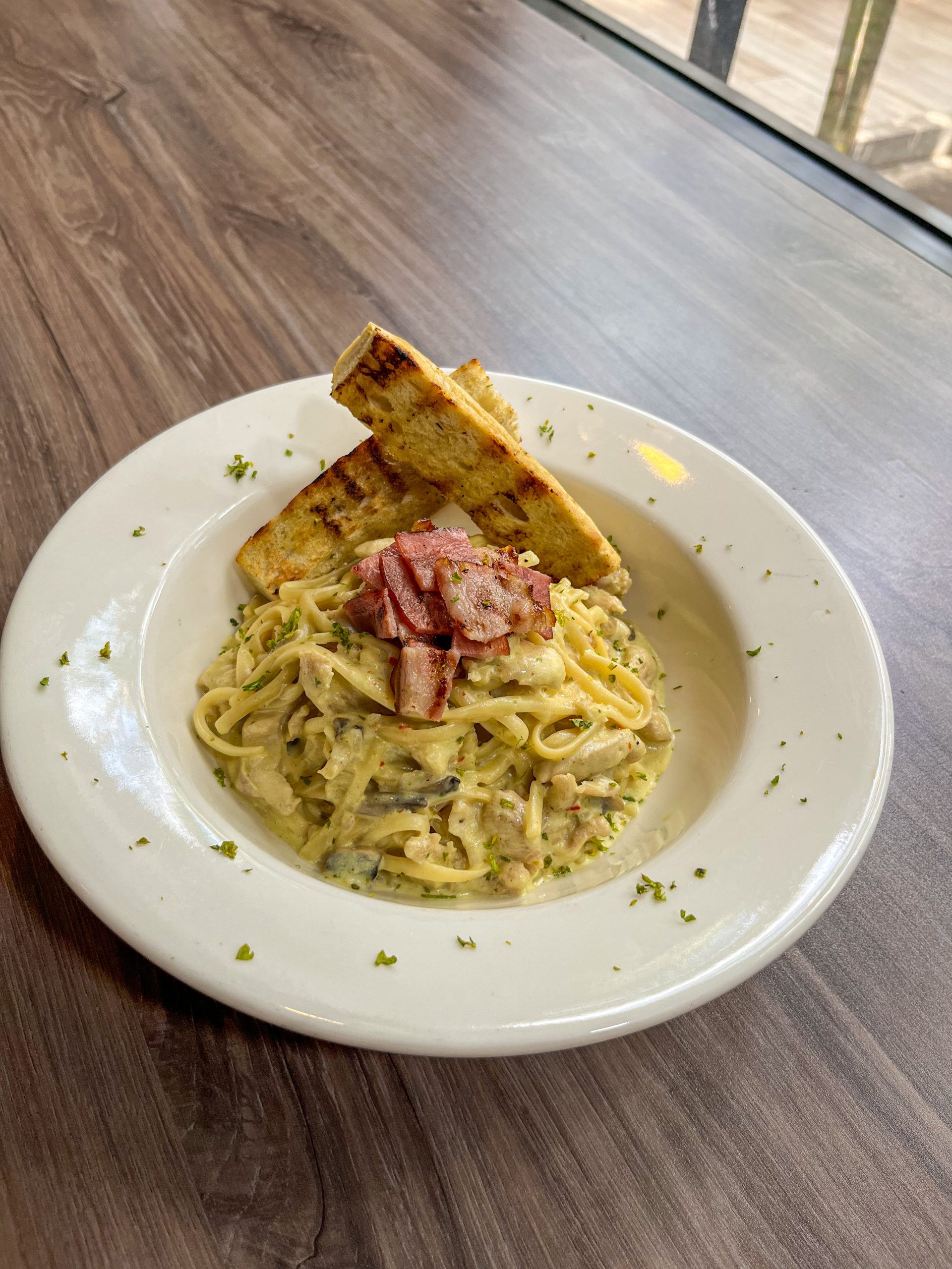 Linguine Pasta, Chicken, Bacon, Mushroom Fresh Basil, Parmesan Cheese Tossed with Creamy White Sauce